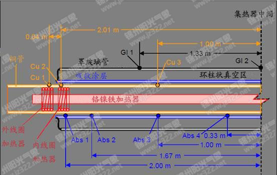 罩玻璃管(Gl)銅管(Cu)和內管(Abs)熱偶計在高溫管的位置(另一半沒有標出)銅管和罩玻璃管表面的熱電偶固定方法:用金屬絲把熱偶計纏繞在表面。
