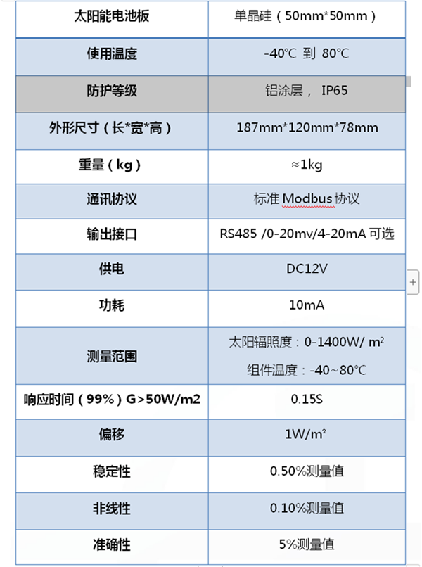 硅基太陽能電池,能夠作為輻照度傳感器,是因為其短路電流與輻照度成正比。我們的傳感器使用的單晶硅太陽能電池并聯。由于并聯的低電阻, 運行時電流與短路電流幾乎相同。為了最小化溫度對測量信號的影響,增加了溫度傳感器來補償數據,傳感器安裝在電池板的后面,檢測值可近似等同于組件溫度。
