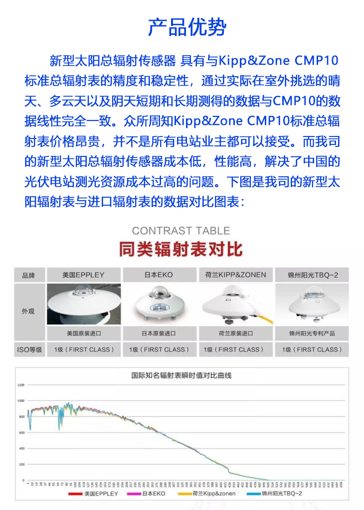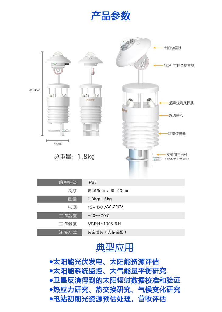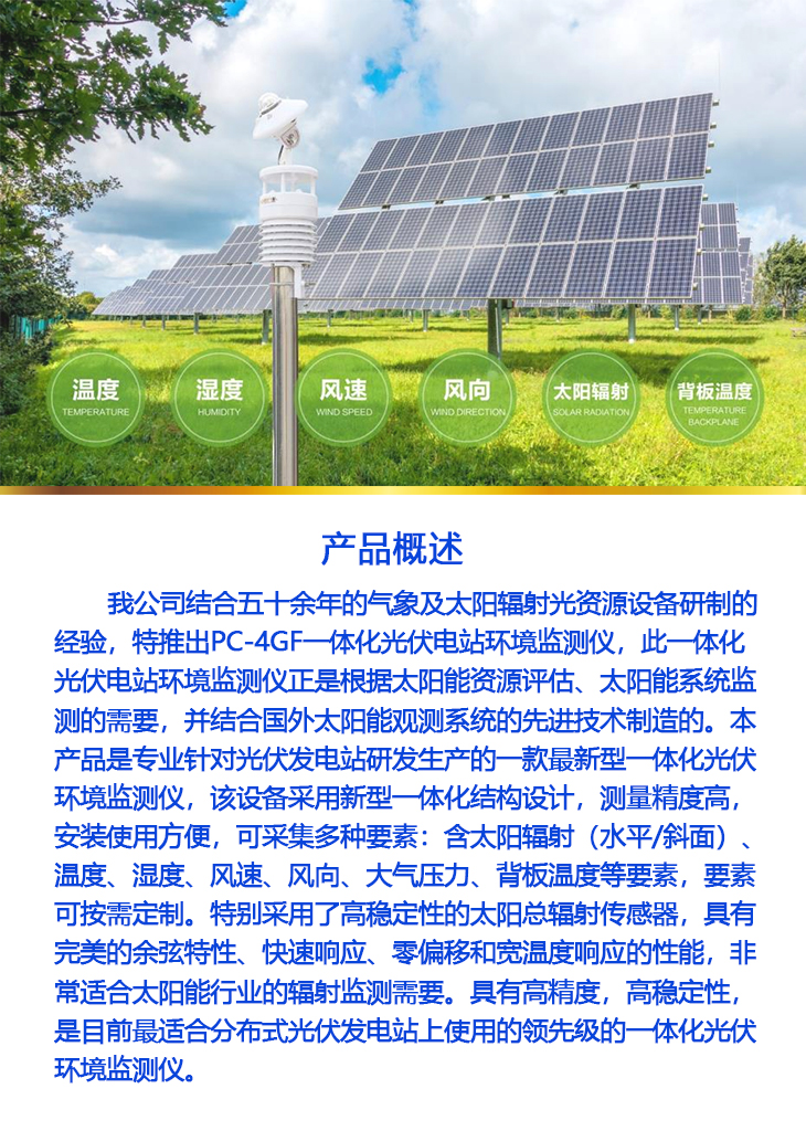 本產品是針對光伏發電站研發生產的一款最新型一體化光伏環境監測儀,該設備采用新型一體化結構設計,測量精度高,安裝使用方便,可采集多種要素:含太陽輻射(水平/斜面)、溫度、濕度、風速、風向、大氣壓力、背板溫度等要素,要素可按需定制。