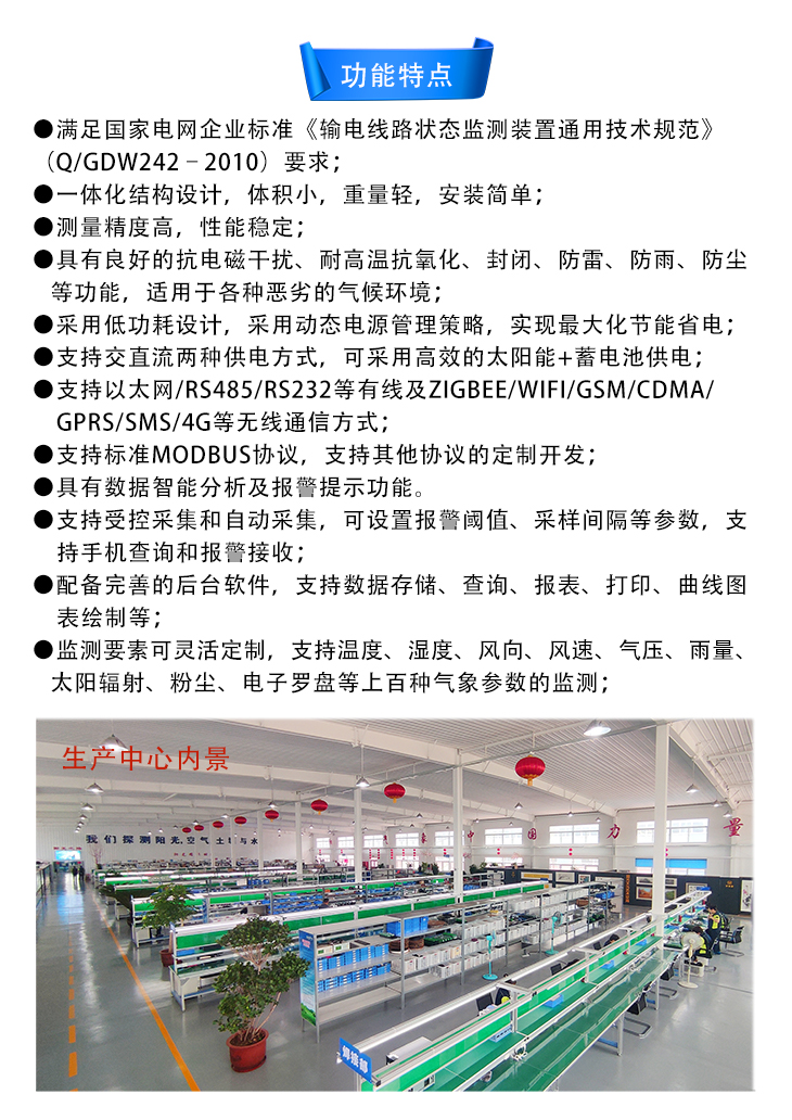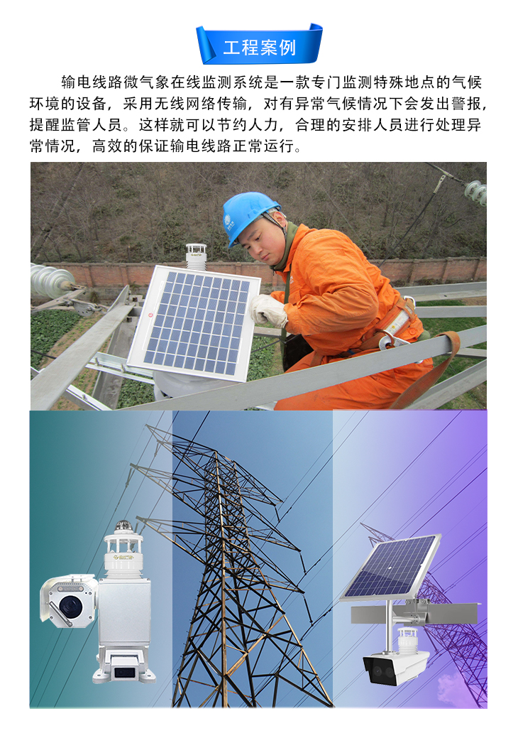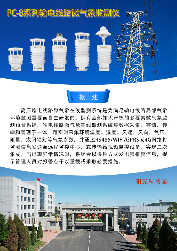 高壓輸電線路微氣象在線監(jiān)測系統(tǒng)是為滿足輸電線路局部氣象環(huán)境監(jiān)測需要而自主研發(fā)的、擁有全部知識產(chǎn)權(quán)的多要素微氣象監(jiān)測預(yù)警系統(tǒng),輸電線路微氣象在線監(jiān)測系統(tǒng)集數(shù)據(jù)采集、存儲、傳輸和管理于一體,可實(shí)時采集環(huán)境溫度、濕度、風(fēng)速、風(fēng)向、氣壓、雨量、太陽輻射等氣象參數(shù),并通過RS485/WiFi/GPRS或4G網(wǎng)絡(luò)將監(jiān)測信息發(fā)送至遠(yuǎn)程監(jiān)控中心,或傳輸給視頻監(jiān)控設(shè)備,實(shí)現(xiàn)二次集成。當(dāng)出現(xiàn)異常情況時,系統(tǒng)會以多種方式發(fā)出預(yù)報(bào)警信息,提示管理人員對報(bào)警點(diǎn)予以重視或采取必要措施。