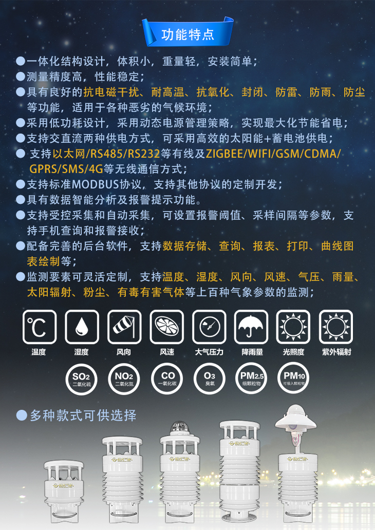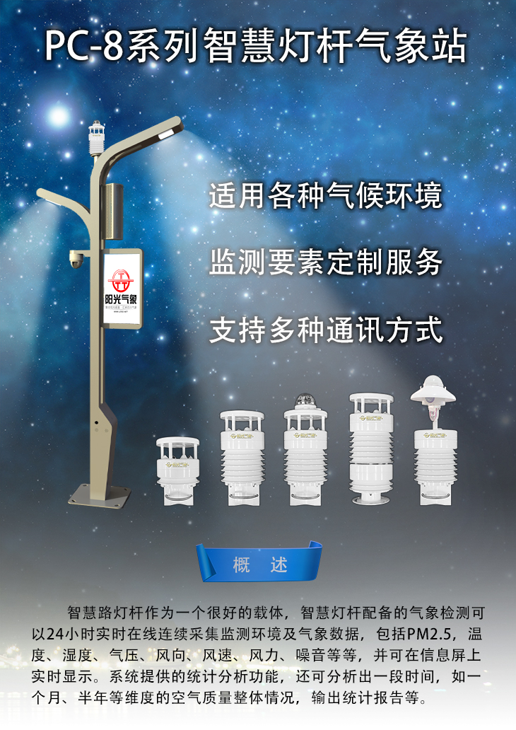 智慧路燈桿作為一個很好的載體,智慧燈桿配備的氣象檢測可以24小時實(shí)時在線連續(xù)采集監(jiān)測環(huán)境及氣象數(shù)據(jù),包括PM2.5,溫度、濕度、氣壓、風(fēng)向、風(fēng)速、風(fēng)力、噪音等等,并可在信息屏上實(shí)時顯示。系統(tǒng)提供的統(tǒng)計分析功能,還可分析出一段時間,如一個月、半年等維度的空氣質(zhì)量整體情況,輸出統(tǒng)計報告等。