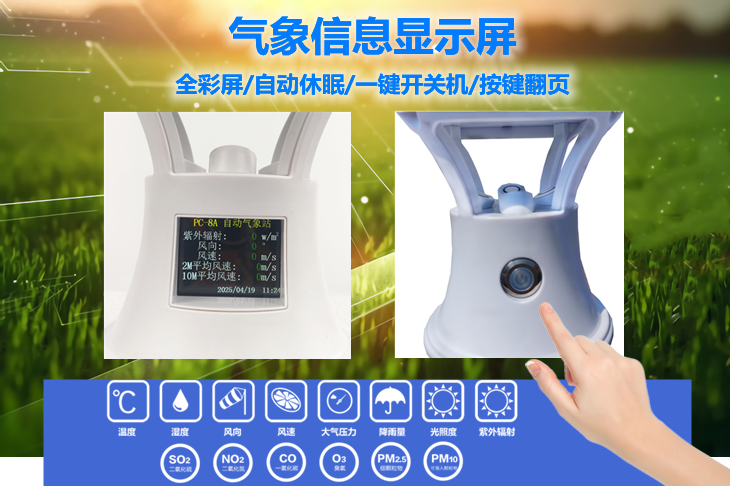 3. 全彩顯示屏和多功能按鍵:氣象站搭配了全彩顯示屏,彌補(bǔ)了常規(guī)氣象站無法就地顯示的缺陷,多功能按鍵可以實(shí)現(xiàn)一鍵開關(guān)機(jī)、數(shù)據(jù)自動(dòng)翻頁和背光顯示等功能。